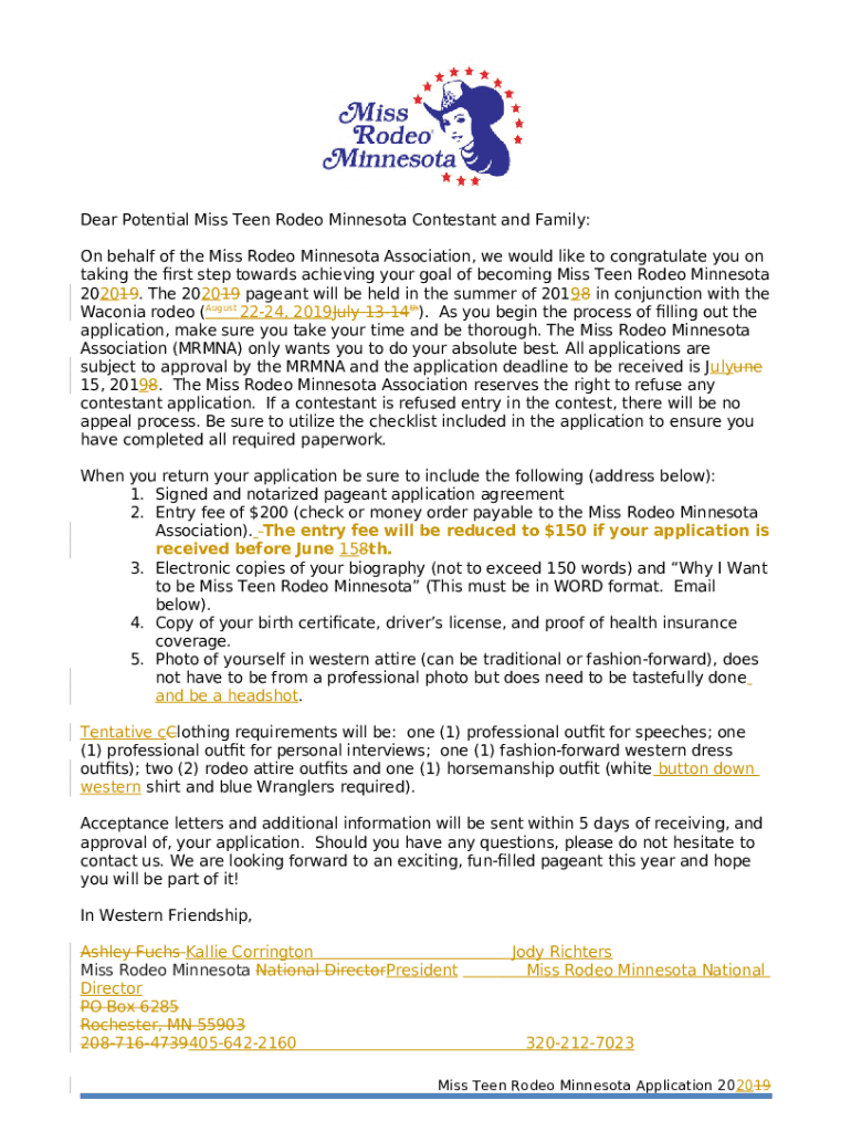 Instructions for the form Dear Potential Miss Teen Rodeo Minnesota Contestant and Family:
