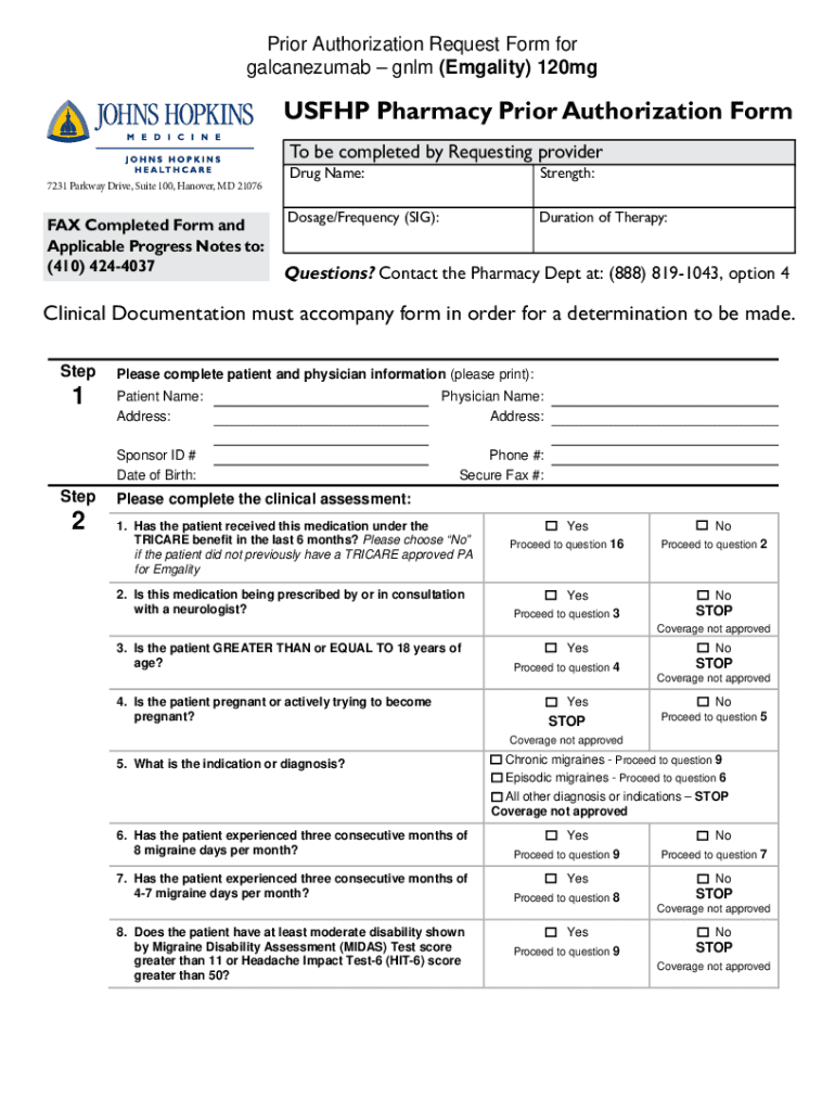 Prior Authorization Request Form for galcanezumab GLM (Equality) 120mgUSFHP Pharmacy Prior Authorization Form To be completed by Requesting provider 7231 Parkway Drive, Suite 100, Hanover, MD 21076FAX