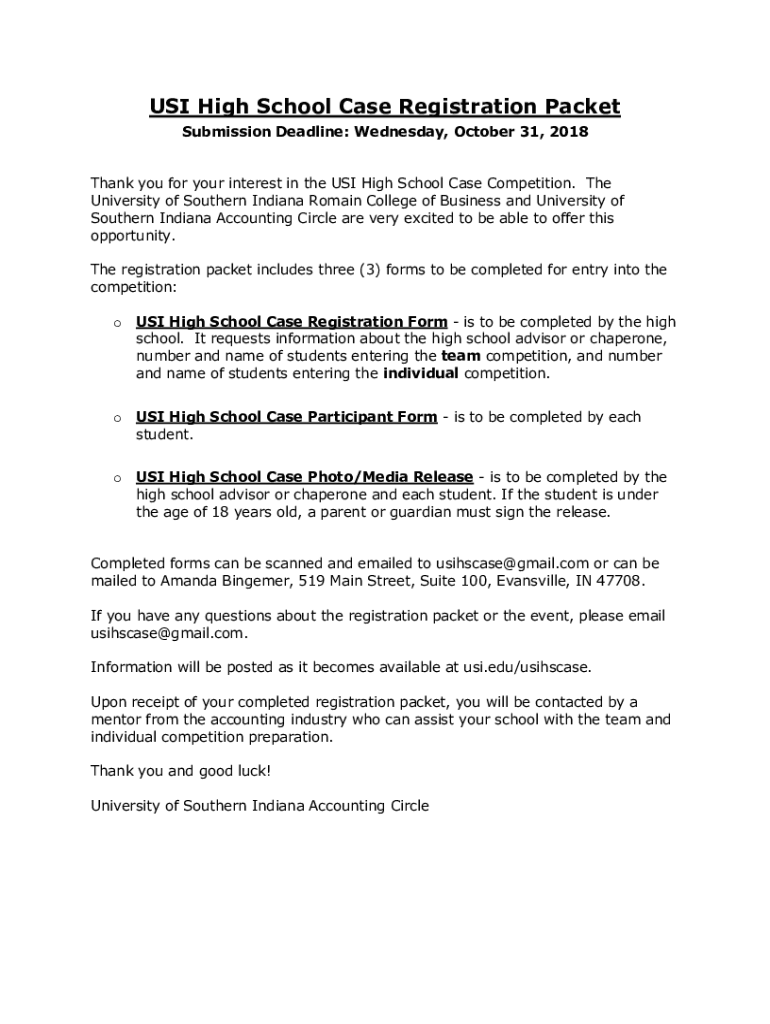 USI High School Case Registration Packet Submission Deadline: Wednesday, October 31, 2018, Thank you for your interest in the USI High School Case Competition. The University of Southern Indiana Romain