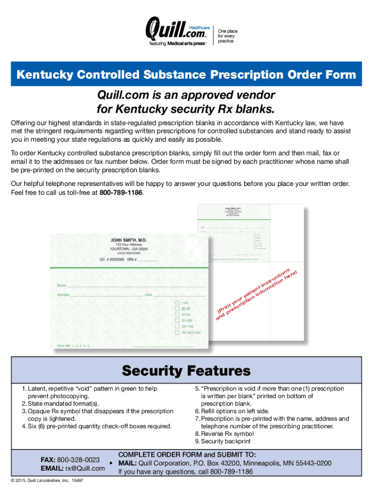 Kentucky Controlled Substance Prescription Order Form Quill.com is an approved vendor for Kentucky security Rx blanks. Offering our highest standards in state regulated prescription blanks in accordance