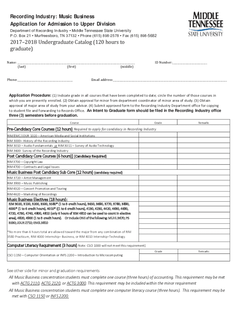 Recording Industry: Music Business Application for Admission to Upper Division Department of Recording Industry Middle Tennessee State University P.O. Box 21 Murfreesboro, TN 37132 Phone (615) 8982578