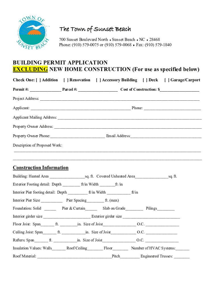 The Town of Sunset Beach 700 Sunset Boulevard North Sunset Beach NC 28468 Phone: (910) 5790075 or (910) 5790068 Fax: (910) 5791840BUILDING PERMIT APPLICATION EXCLUDING NEW HOME CONSTRUCTION (For use
