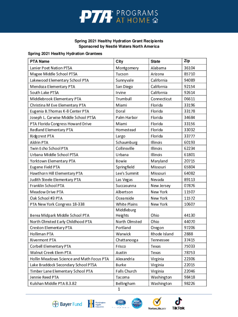 Get the free Healthy Hydration Grantees, Sponsored by ... - National PTA