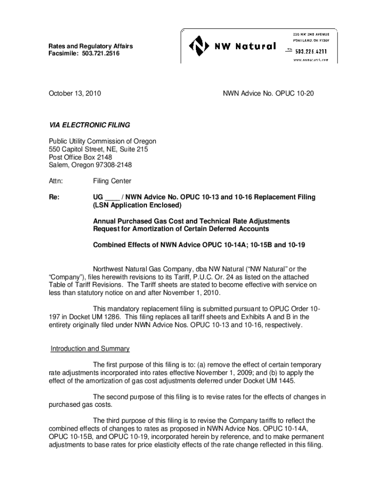 Rates and Regulatory Affairs Facsimile: 503.721.2516October 13, 2010NWN Advice No. OPUS 1020VIA ELECTRONIC FILING Public Utility Commission of Oregon 550 Capitol Street, NE, Suite 215 Post Office