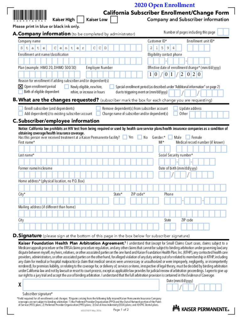 2020 Open Enrollment×603376096×California Subscriber Enrollment/Change Form Kaiser High Kaiser Company and Subscriber informationPlease print in blue or black ink only.