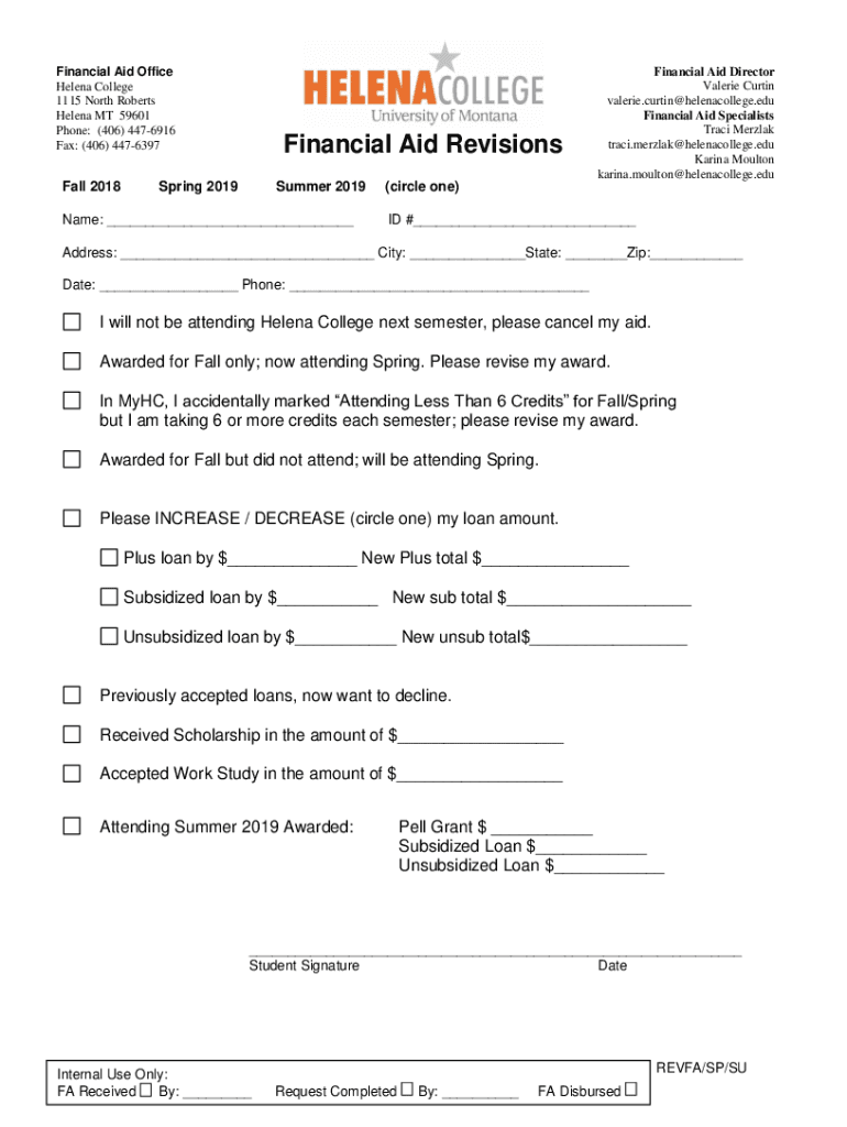Financial Aid Office Helena College 1115 North Roberts Helena MT 59601 Phone: (406) 4476916 Fax: (406) 4476397Fall 2018Financial Aid RevisionsSpring 2019Summer 2019Name: (circle one)Financial Aid