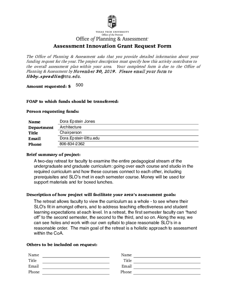 Assessment Innovation Grant Request Form The Office of Planning & Assessment asks that you provide detailed information about your funding request for the year. The project description must specify
