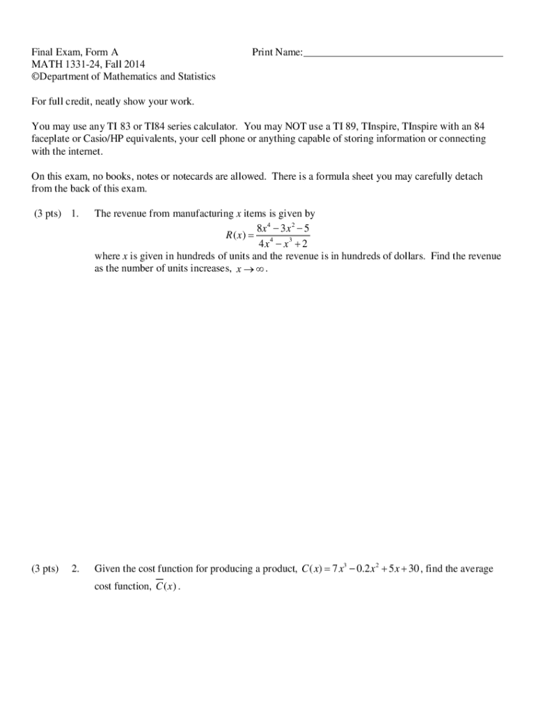 Get the free Final Exam, Form A Print Name: MATH 1331-24, Fall 2014 ...