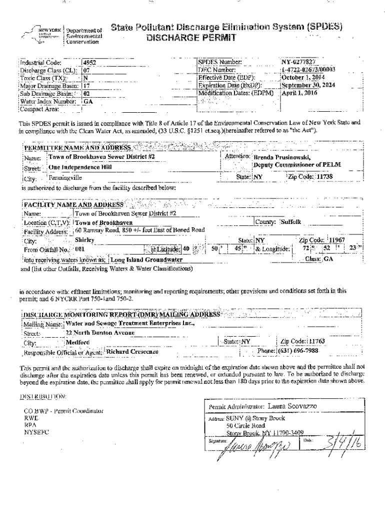 /LU* “too Sr error/PFoatuNtYlI I Department of Environmental Conservationist Meat ffiEsahngc ffimmatm System ffiPmffi$ M$ffiHARGffi PffiRMTIIndustrial Code: Class CL 'Disc Toxic Class4952SPDES Number:ly02r78??07DECNumber: