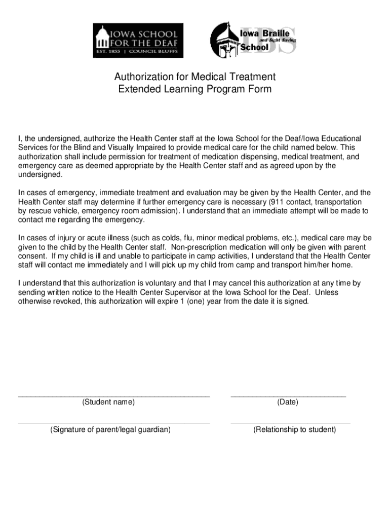 Extended Learning Program Form, the undersigned, authorize the Health Center staff at the Iowa School for the Deaf/Iowa Educational