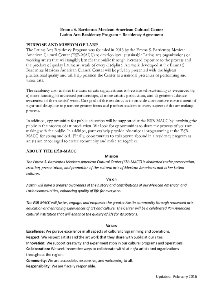 Emma S. Barriers Mexican American Cultural Center Latino Arts Residency Program Residency Agreement PURPOSE AND MISSION OF LAP The Latino Arts Residency Program was founded in 2013 by the Emma S.