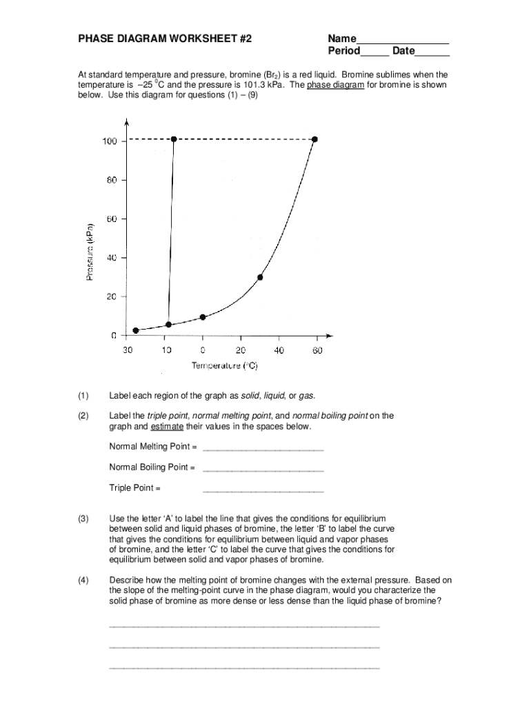 PHASE DIAGRAM WORKSHEET #2Name Period Date At standard temperature and pressure, bromine (Br2) is a red liquid. Bromine sublimes when the 0 temperature is 25 C and the pressure is 101.3 PA. The phase