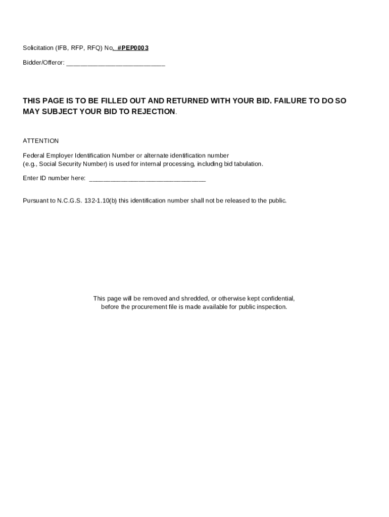 How to fill out This page will be removed and shredded, or otherwise kept confidential, before the procurement file is made available for public inspection