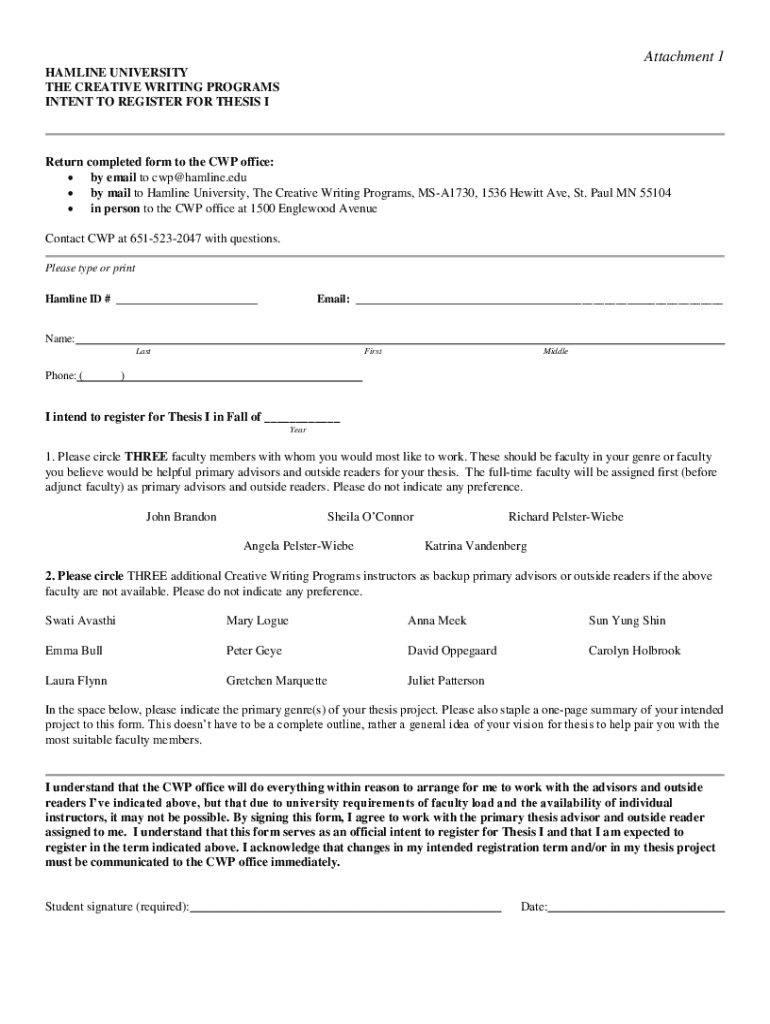 Attachment 1 HAMLIN UNIVERSITY THE CREATIVE WRITING PROGRAMS INTENT TO REGISTER FOR THESIS Return completed form to the CWP office: by email to CWP Hamlin.edu by mail to Hamlin University, The Creative