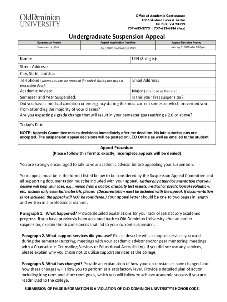 Office of Academic Continuance 1006 Student Success Center Norfolk, VA 23529 7576833773 7576836884 (Fax)Undergraduate Suspension Appeal Suspension PostedAppeal Application Deadline December 18, 2019By