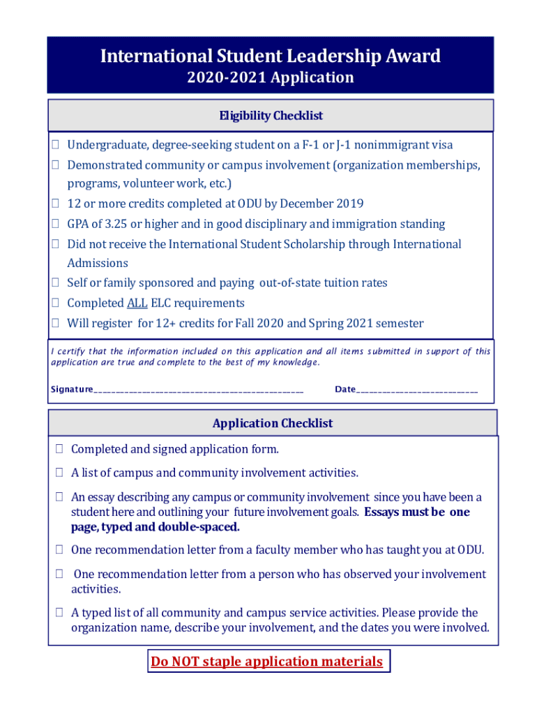 International Student Leadership Award 20202021 Application Eligibility Checklist Undergraduate, degree seeking student on a F1 or J1 nonimmigrant visa Demonstrated community or campus involvement