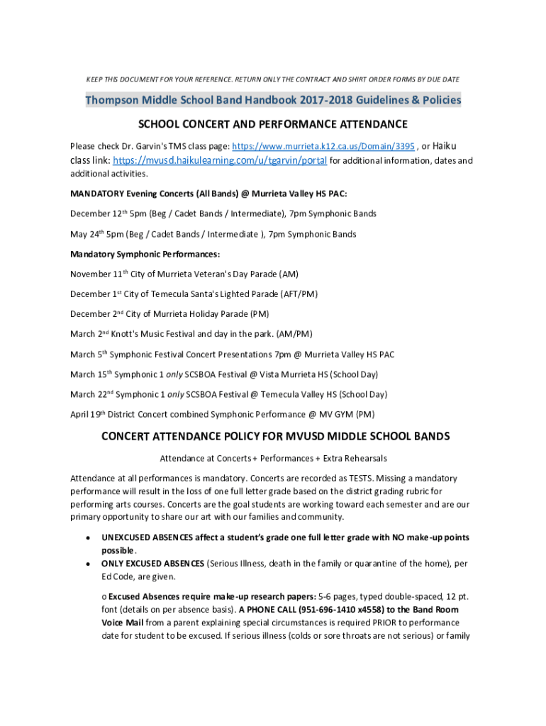 KEEP THIS DOCUMENT FOR YOUR REFERENCE. RETURN ONLY THE CONTRACT AND SHIRT ORDER FORMS BY DUE DATE Thompson Middle School Band Handbook 20172018 Guidelines & Policies SCHOOL CONCERT AND PERFORMANCE