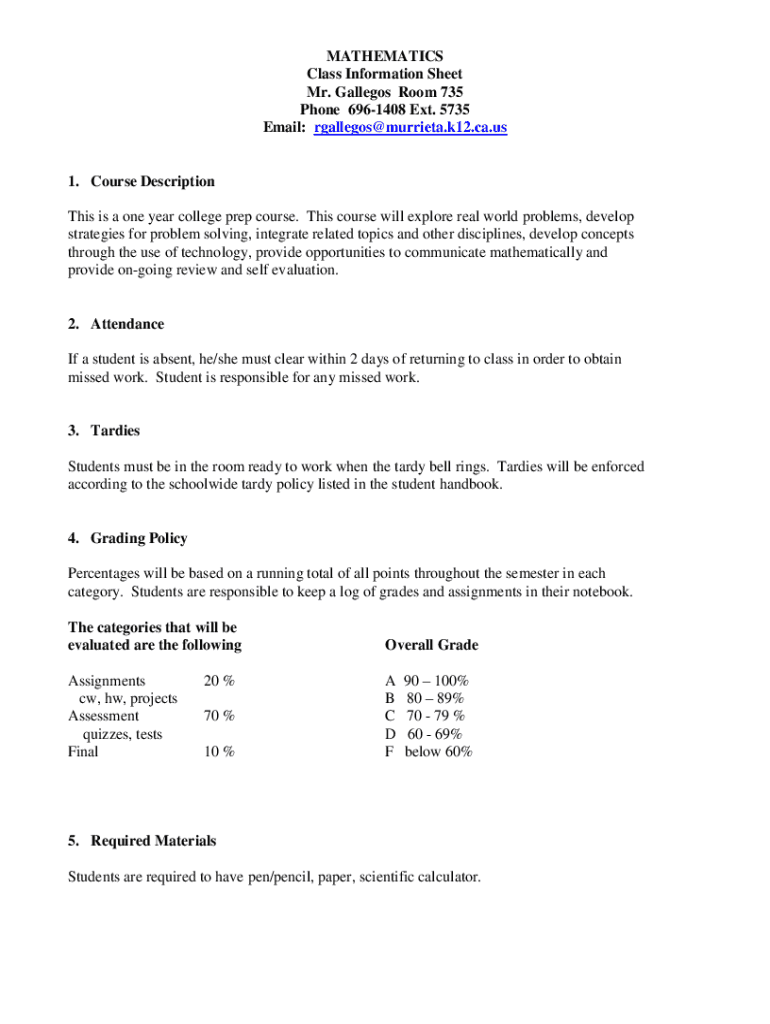 Get the free MATHEMATICS Class Information Sheet Mr. Gallegos Room ...