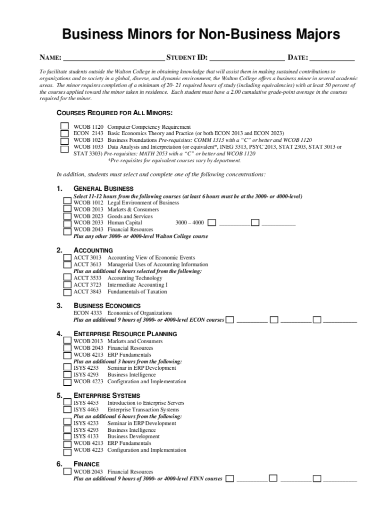 Business Minors for Business Majors NAME: STUDENT ID: DATE: To facilitate students outside the Walton College in obtaining knowledge that will assist them in making sustained contributions to organizations