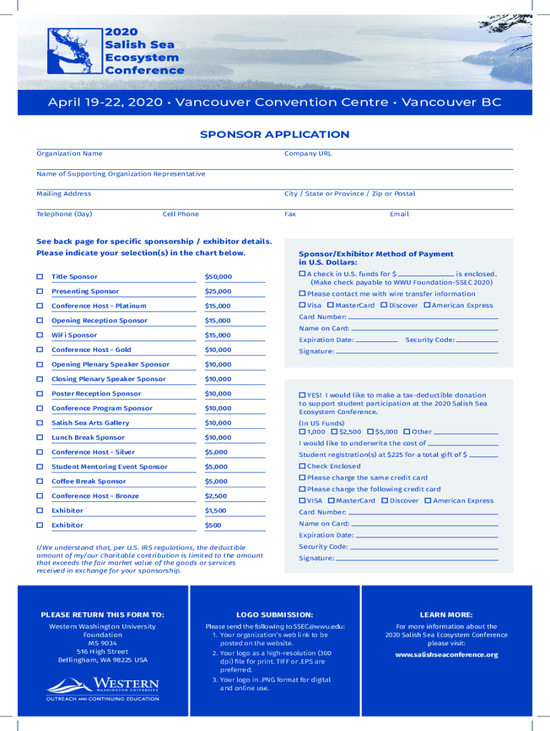 April 1922, 2020 Vancouver Convention Center Vancouver BC SPONSOR APPLICATION Organization Accompany Surname of Supporting Organization Representative Mailing Addressing / State or Province / Zip