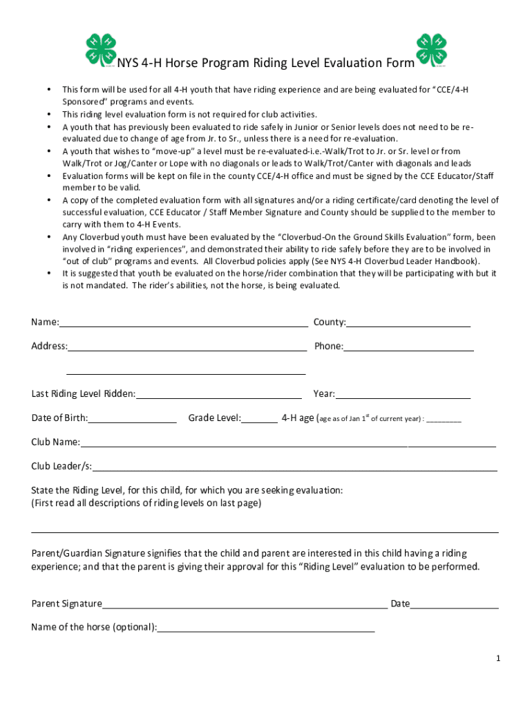 NYS 4H Horse Program Riding Level Evaluation Form This form will be used for all 4H youth that have riding experience and are being evaluated for CCE/4HSponsored programs and events. This riding level