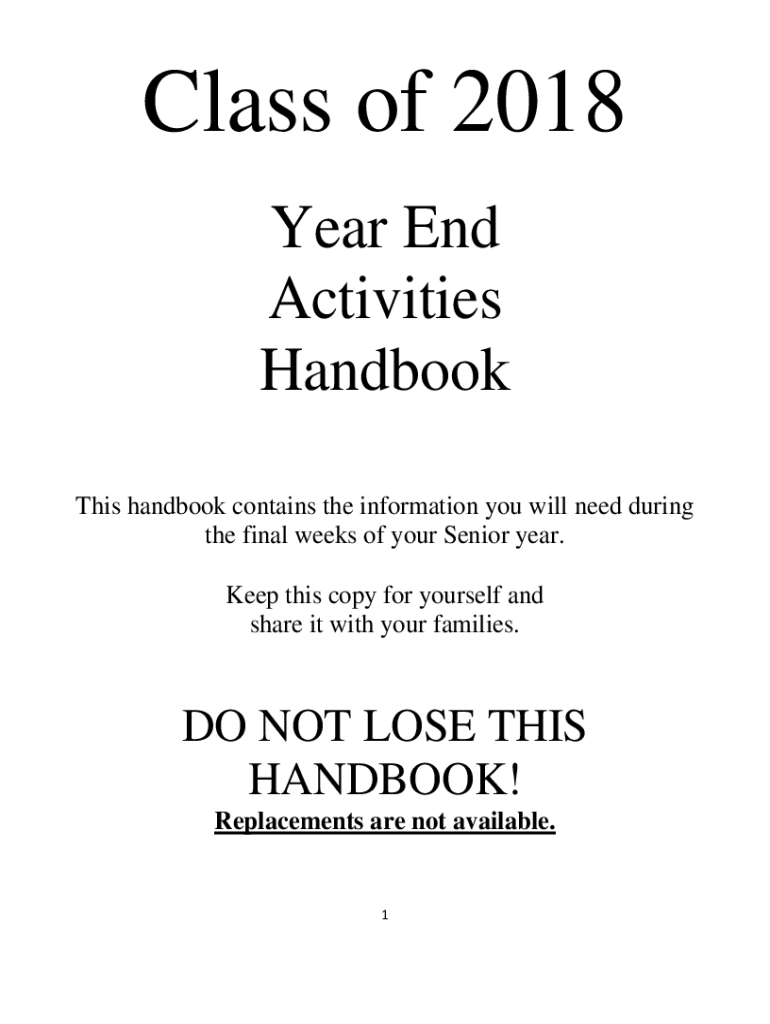 Class of 2018 Year End Activities Handbook This handbook contains the information you will need during the final weeks of your Senior year. Keep this copy for yourself and share it with your families.