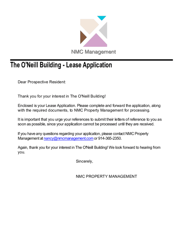 The O 'Neill Building Lease Application Dear Prospective Resident: Thank you for your interest in The O 'Neill Building! Enclosed is your Lease Application. Please complete and forward the application,
