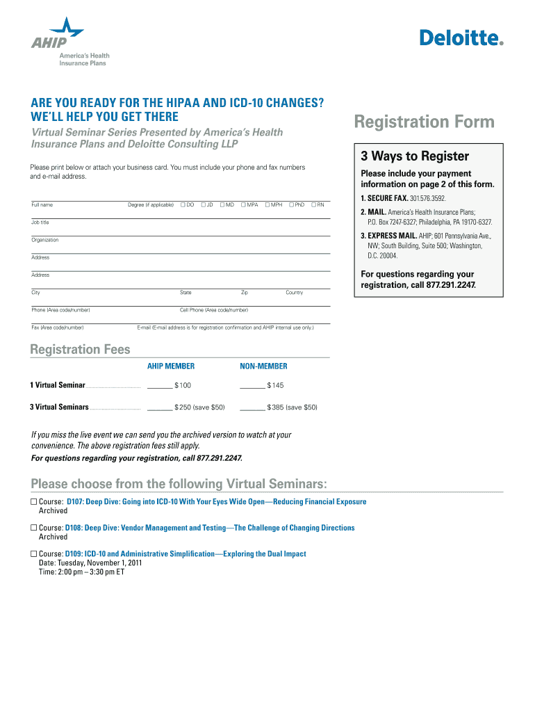 The HIPAA and ICD-10 Changes Registration Form is designed for healthcare professionals to register for educational seminars. Its primary purpose is to facilitate attendance at virtual sessions provided by America's Health Insurance Plans and Deloitte Consulting. An essential aspect of this process is registering for these informative seminars, which can help in understanding key changes in healthcare regulations.