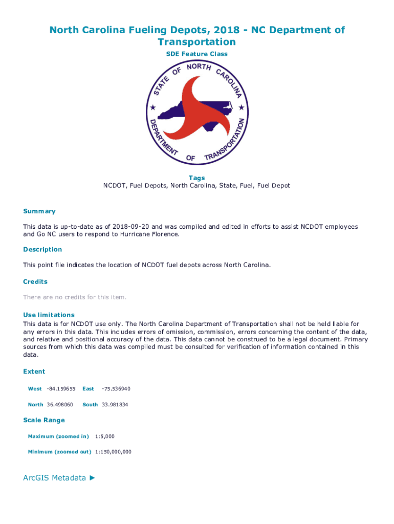 North Carolina Fueling Depots, 2018 NC Department of Transportation SDE Feature Classes NC DOT, Fuel Depots, North Carolina, State, Fuel, Fuel DepotSummary This data is update as of 20180920 and was