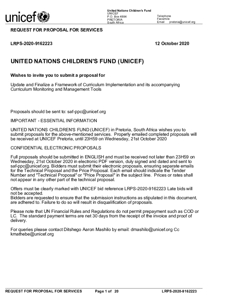 United Nations Children's Fund UNICEF Telephone P.O. Box 4884 Facsimile PRETORIA Email Pretoria UNICEF.org South AfricaREQUEST FOR PROPOSAL FOR SERVICES LRPS2020916222312 October 2020UNITED NATIONS