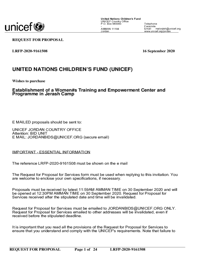United Nations Children's Fund UNICEF Country Office Telephone P.O. Box 940043 Facsimile Email Malone UNICEF.org AMMAN 11194 www.unicef.org/jordan Jordan REQUEST FOR PROPOSAL LRFP2020916150816 September