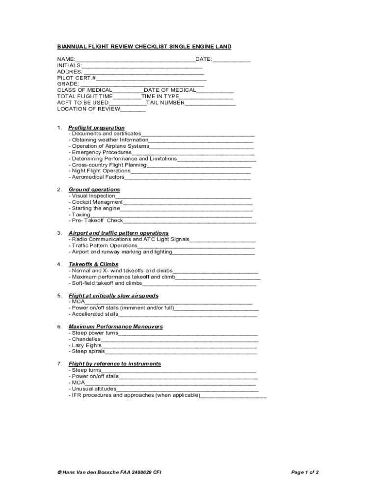BIANNUAL FLIGHT REVIEW CHECKLIST SINGLE ENGINE LAND NAME: DATE: INITIALS: ADDRESS: PILOT CERT.# GRADE: CLASS OF MEDICAL DATE OF MEDICAL TOTAL FLIGHT TIME IN TYPE ACT TO BE USED TAIL NUMBER LOCATION