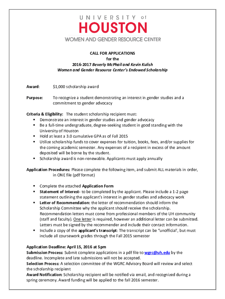 CALL FOR APPLICATIONS for the 20162017 Beverly Mikhail and Kevin Mulish Women and Gender Resource Centers Endowed ScholarshipAward:$1,000 scholarship awardPurpose:To recognize a student demonstrating