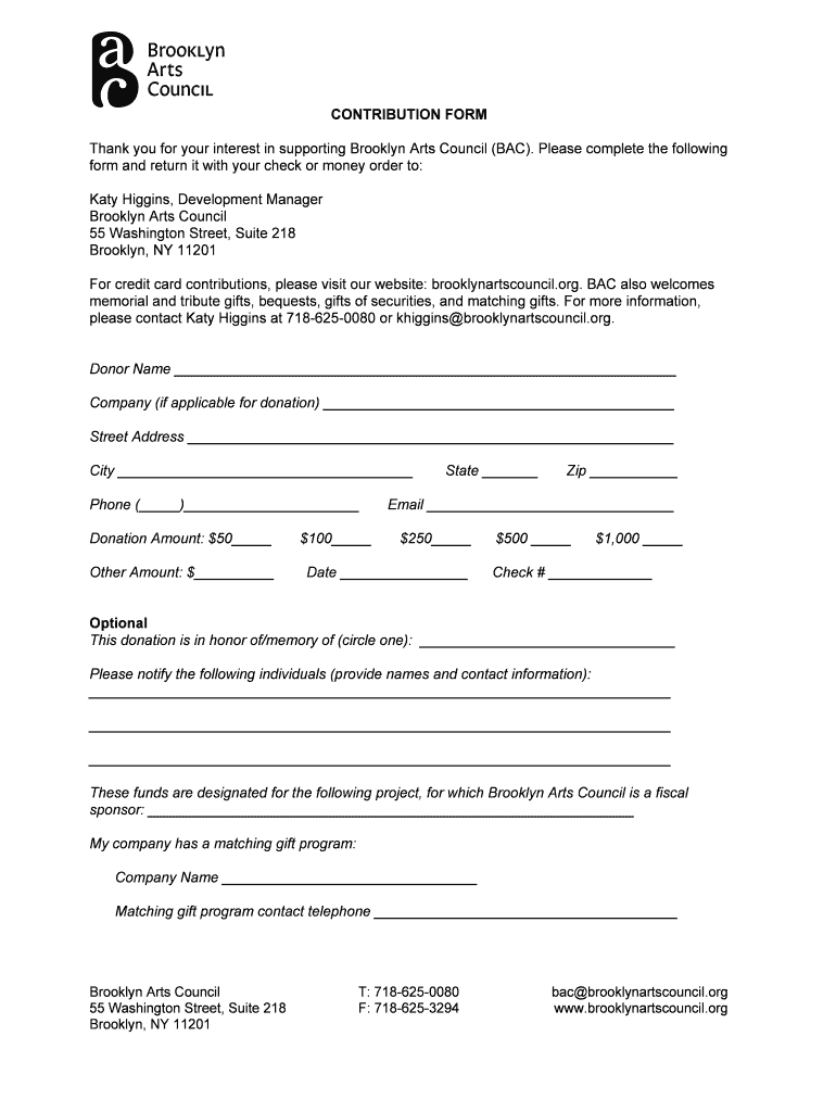 The Brooklyn Arts Council Contribution Form is designed with clarity and functionality in mind. Key fields on the form include: