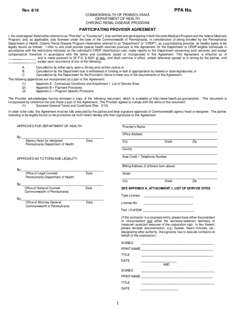 PPA No. Rev. 8/18 COMMONWEALTH OF PENNSYLVANIA DEPARTMENT OF HEALTH CHRONIC RENAL DISEASE PROGRAMPARTICIPATING PROVIDER AGREEMENT I, the undersigned (hereinafter referred to as “Provider or “Contractor