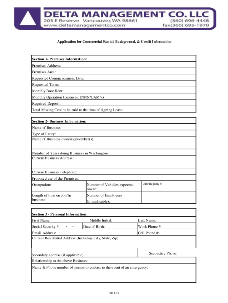 Application for Commercial Rental, Background, & Credit InformationSection 1 Premises Information: Premises Address: Premises Area: Requested Commencement Date: Requested Term: Monthly Base Rent: