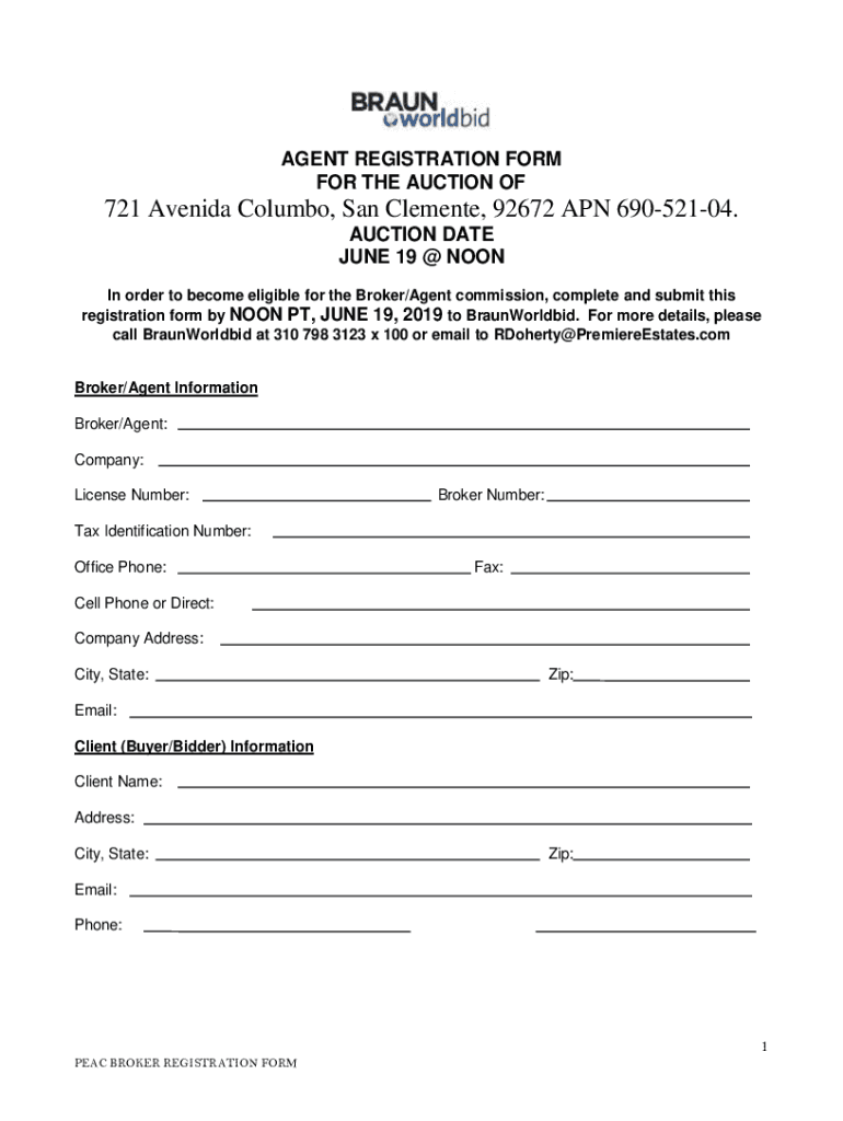 AGENT REGISTRATION FORM FOR THE AUCTION OF721 Agenda Colombo, San Clemente, 92672 APN 69052104. AUCTION DATE JUNE 19 NOON In order to become eligible for the Broker/Agent commission, complete and