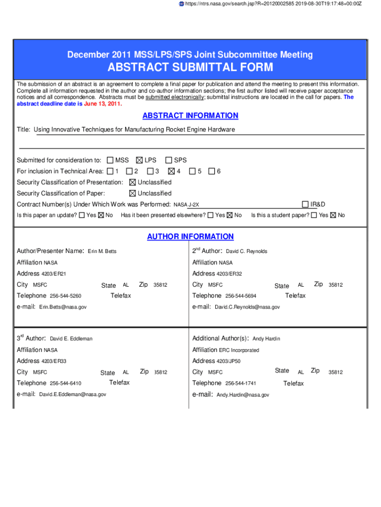 HTTPS://ntrs.nasa.gov/search.jsp? R20120002585 20190830T19:17:48+00:00ZDecember 2011 MSS/LPS/SPS Joint Subcommittee MeetingABSTRACT SUBMITTAL From
