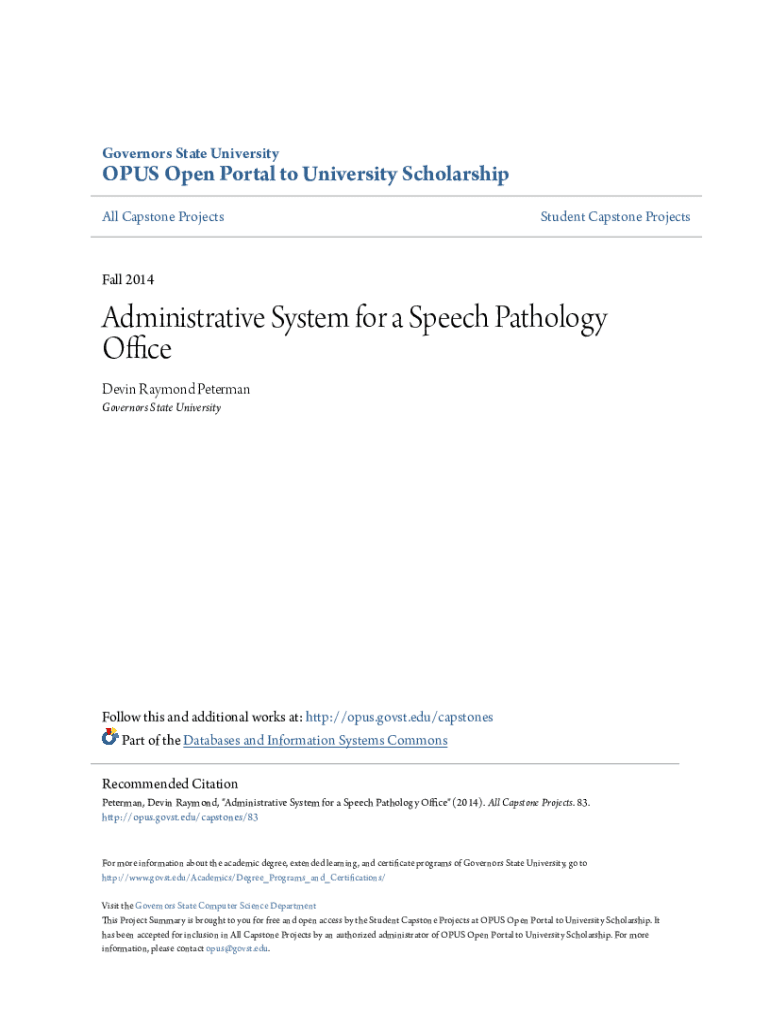 Governors State UniversityOPUS Open Portal to University Scholarship All Capstone ProjectsStudent Capstone ProjectsFall 2014Administrative System for a Speech Pathology Office Devin Raymond Peter