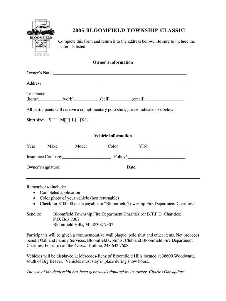 Get the free Classic Car Show Entrance Form - Bloomfield Township - bloomfieldtwp