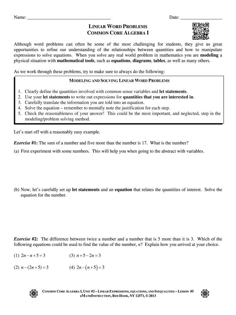 Name: Date: LINEAR WORD PROBLEMS COMMON CORE ALGEBRA I Although word problems can often be some of the most challenging for students, they give us great opportunities to refine our understanding of