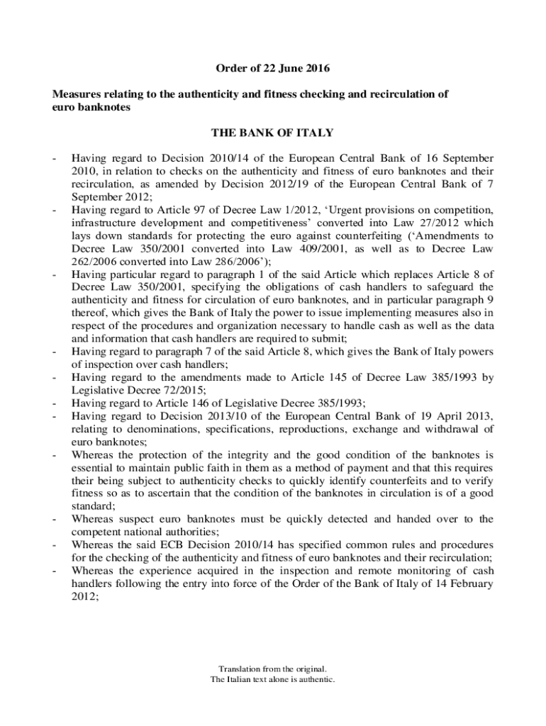 Get the free Order of 22 June 2016 Measures relating to the ... - Banca d'Italia