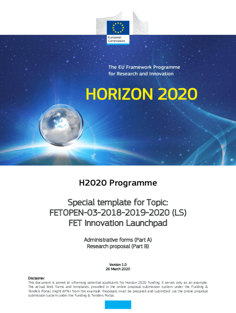 H2020 Program Special template for Topic: FETOPEN03201820192020 (LS) FET Innovation Launchpad Administrative forms (Part A) Research proposal (Part B) Version 1.0 26 March 2020 Disclaimer This document