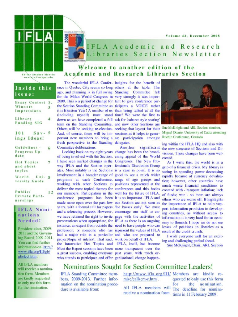 Volume 42, December 2008IFLA Academic and Research Libraries Section Newsletter Editor Stephen Marvin cup. Duel co me t o an o the r ed it ion o f the Academic and Research Libraries Sectionize wonderful