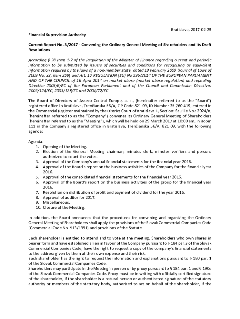 Bratislava, 20170225 Financial Supervision Authority Current Report No. 3/2017 Convening the Ordinary General Meeting of Shareholders and its Draft Resolutions According 38 item 12 of the Regulation