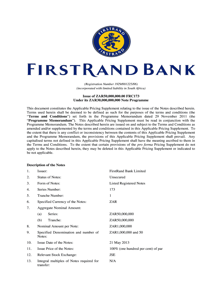 (Registration Number 1929/001225/06) (incorporated with limited liability in South Africa) Issue of ZAR50,000,000.00 FRC173 Under its ZAR30,000,000,000 Note Programs This document constitutes the