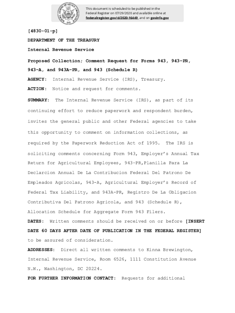 This document is scheduled to be published in the Federal Register on 07/29/2020 and available online at federalregister.gov/d/202016449, and on gov info.gov 483001p DEPARTMENT OF THE TREASURY Internal