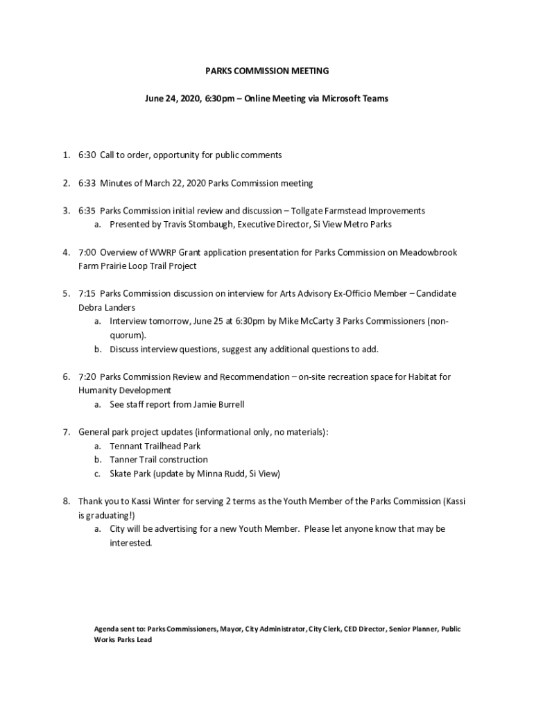 PARKS COMMISSION MEETING June 24, 2020, 6:30pm Online Meeting via Microsoft Teams1. 6:30 Call to order, opportunity for public comments 2. 6:33 Minutes of March 22, 2020, Parks Commission meeting