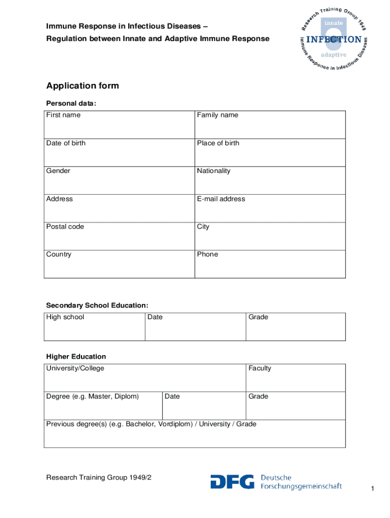 Immune Response in Infectious Diseases Regulation between Innate and Adaptive Immune ResponseApplication form Personal data: First nameFamily namesake of birthplace of birthGenderNationalityAddressEmail