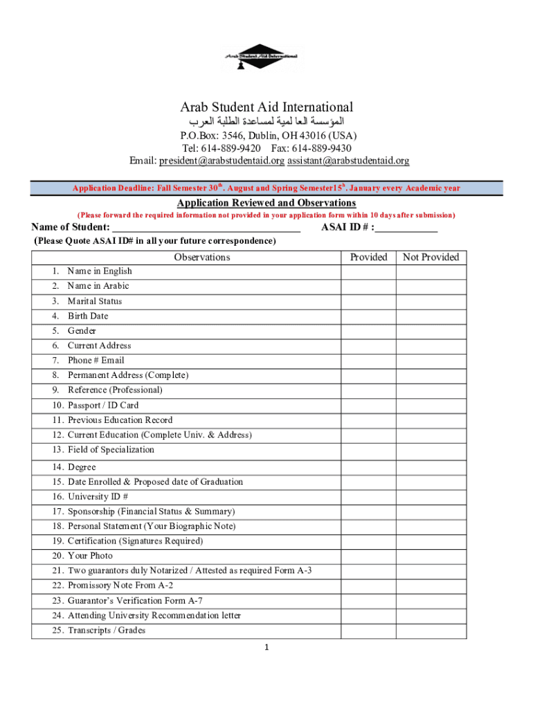 Arab Student Aid International P.O. Box: 3546, Dublin, OH 43016 (USA)Tel: 6148899420 Fax: 6148899430Email: president arabstudentaid.org assistant arabstudentaid. Reapplication Deadline: Fall Semester